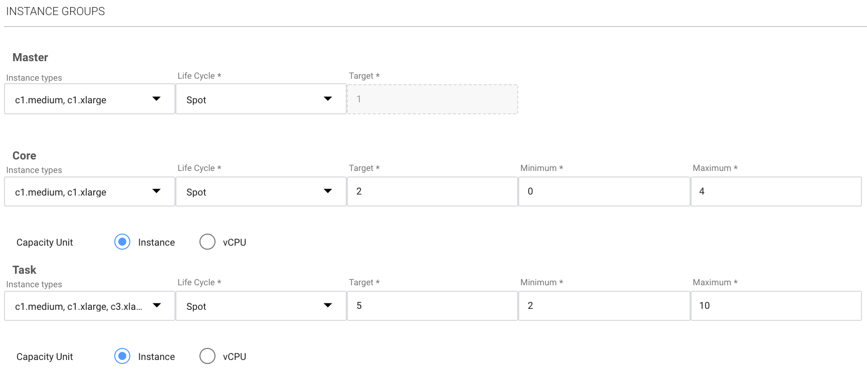 • Instance Types: Choose one or more preferred instance types for the task instances.