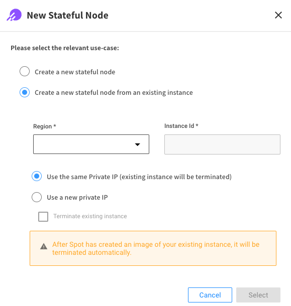 The New Stateful Node window opens. Mark the use-case Create a New Stateful Node from an Existing Instance.