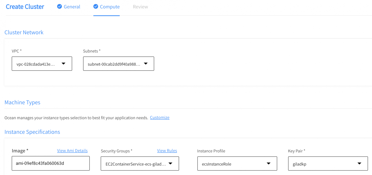 - Ocean imports the compute configuration from your ECS cluster and displays it in the Compute page. Confirm or edit the configuration if needed:
