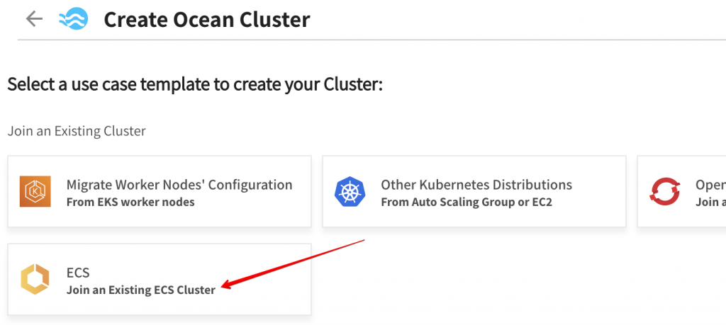 - When the Create Ocean Cluster page appears, you will need to choose a use case template. Under Connect an Existing Cluster, click Connect an Existing ECS Cluster.
