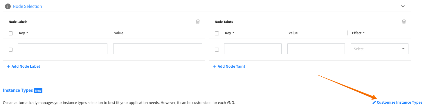 This section enables you to inform Ocean about the labels and taints that are set on the nodes. When they are set, Ocean will use them to choose the right VNG for a pending pod.