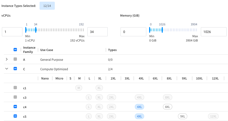 Above the sliders, Instance Types Selected indicates how many of the available instances you have marked (specifically: number of instances marked/number of instances available). This figure changes automatically when you move the sliders or when click or unclick instances. There are similar indicators in the Types column. For example, the illustration above shows that you have marked two Compute Optimized instances out of four that are available.